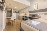 Cet appartement comporte un salon, ainsi qu’une cuisine entièrement équipée avec un réfrigérateur et un four.